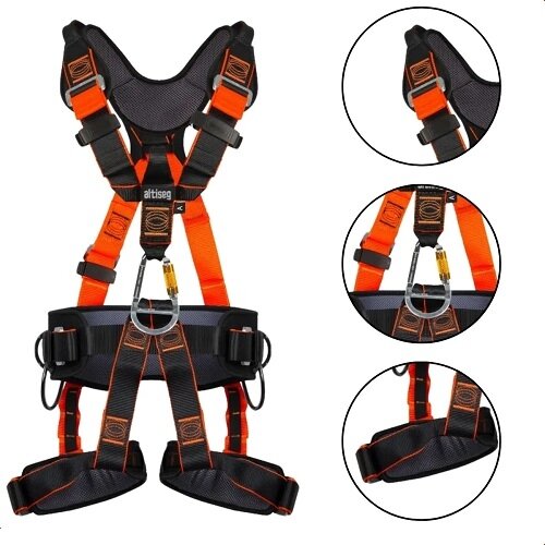 O Cinturão tipo Paraquedista Onyx Pro 3M™ Altiseg é confeccionado em fitas de poliéster (45 mm/1,5 mm) e possui dois elementos de engate para proteção contra queda: um dorsal composto por argola de aço tipo D e um peitoral composto por alça de fita. Possui três elementos de engate para posicionamento e restrição com um ventral e dois laterais, todos compostos por argola tipo D. Conta ainda com duas alças nos ombros para atividades de resgate em espaço confinado e quatro alças porta materiais. Nas costas, possui um passador de fitas anatômico que se ajusta às escápulas e dispositivo indicador de queda; na região lombar, possui uma fita auxiliar para resgate e almofadas de conforto nas pernas, cintura e ombros.
