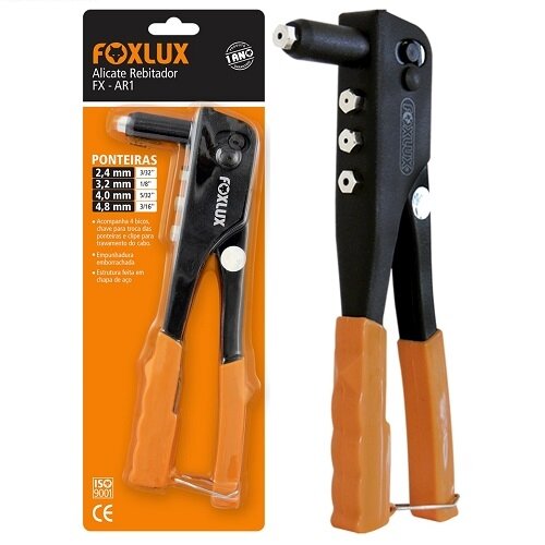 O Alicate Rebitador da Foxlux/Famastil tem a empunhadura emborrachada e a estrutura feita de aço.