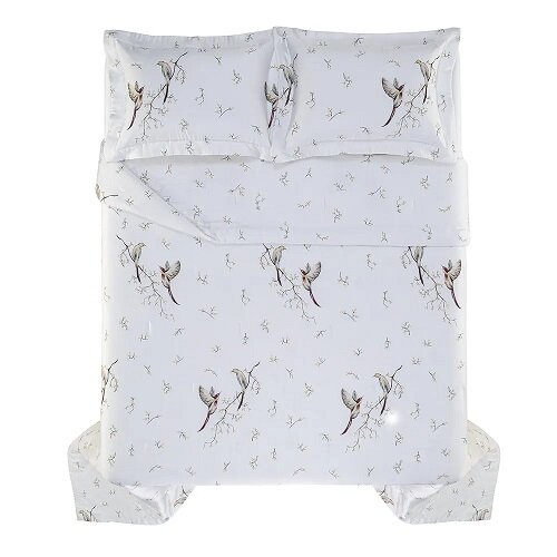 Combinação de Cores: Corpo branco com estampa exclusiva representando pássaros dançando sobre folhagens azuis e amarelas em um emaranhado de galhos.