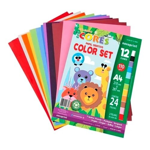 Com 2 folhas de cada cor ( Vermelho, Rosa Claro, Marrom, Laranja, Amarelo, Verde Claro, Verde escuro, Azul claro, Azul, Roxo, Preto , Branco ). Gramatura 110g/m²; Tamanho; A4 ( 21cm X 29,7 cm ). Ideal para impressões, trabalhos manuais, dobradura, recorte, colagem, scrapbook, montagens, kirigami, quilling, artesanato, origami e etc...